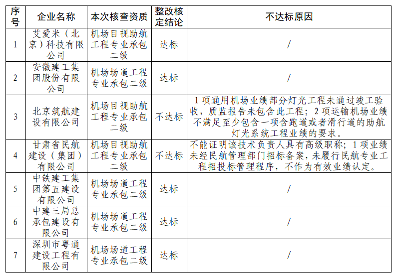 根据《关于开展2023年度民航专业工程建筑业企业资质动态核查的通知》(局发明电〔2023〕1340号)《关于开展2024年度民航专业工程建筑业企业资质动态核查的通知》(局发明电〔2023〕2770号)要求,机场司对部分企业整改材料进行了公示,组织专班对相关情况开展了核实与核定,并对核定意见进行了公示,经对相关异议及举证材料进行复核,形成本次整改核定结论。