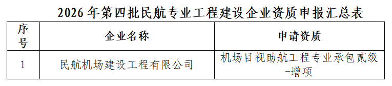 | 名 称:关于2026年第四批民航专业工程建设企业资质申报材料的公示 | |