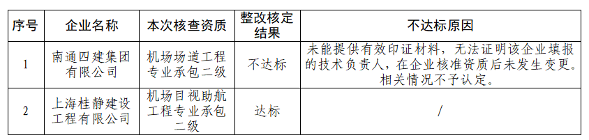 根据《关于开展2023年度民航专业工程建筑业企业资质动态核查的通知》《关于开展2024年度民航专业工程建筑业企业资质动态核查的通知》,机场司组织工作专班,依据相关法规和资质标准,对部分企业整改材料进行研究核定,形成本次整改核定意见,现进行公示。公示时间为2025年11月10日至2025年11月16日。
